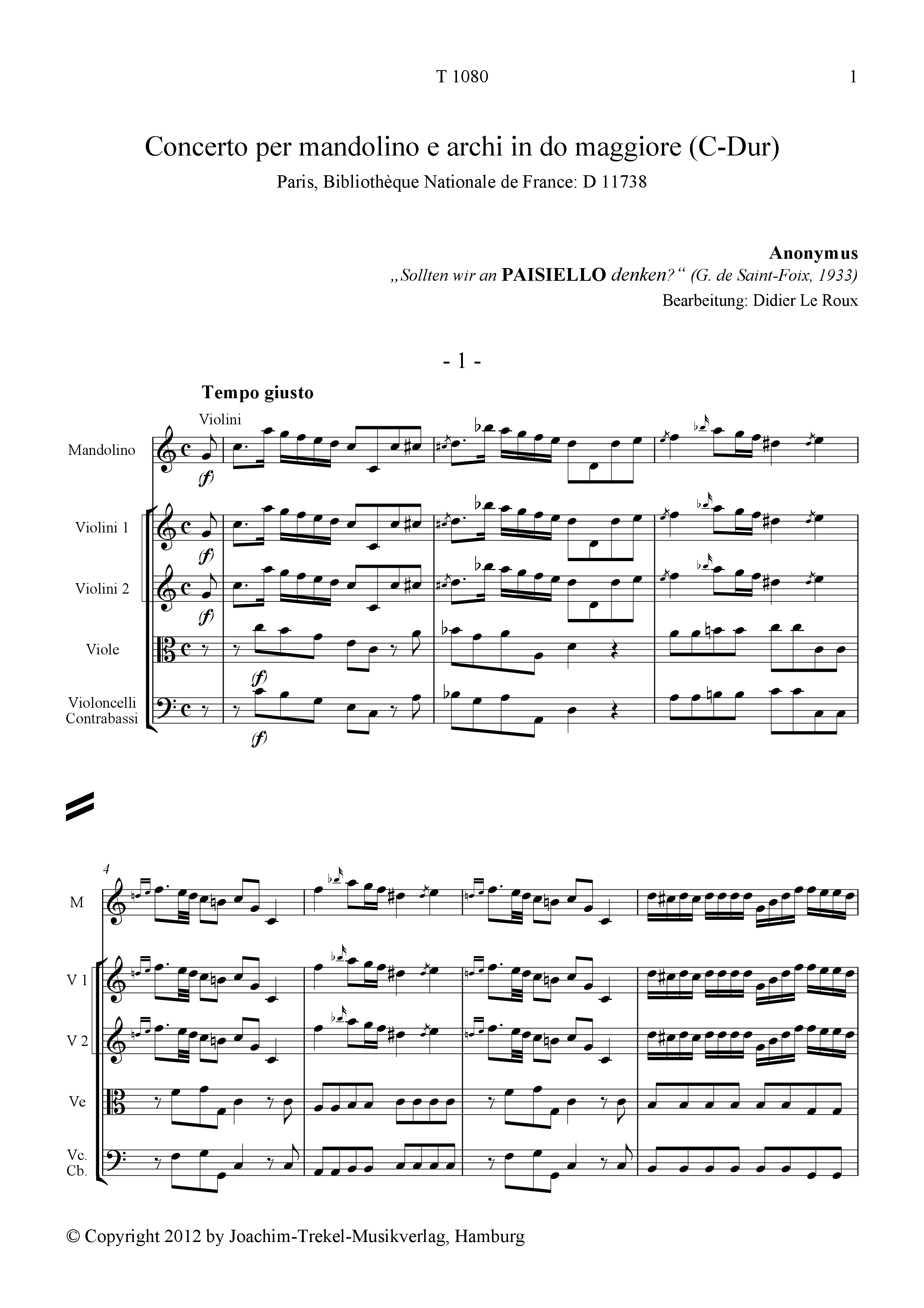 Das einzige handschriftliche Exemplar dieser Concerti in C und in Es-Dur gibt nicht den Komponisten an. Der Musikologe Georges de Saint-Foix, der diese Stücke sehr schätzte, hat folgendes über sie geschrieben (Revue de Musicologie, n° 47, August 1933): „Im ersten dieser anonymen Concerti [in Es], wird das erste Thema von den Violinen vorgetragen, in deren Mitte die Mandoline hervortritt, die nach dem Schluss des ersten Tutti das Anfangsthema wieder aufgreift [...]. Das zweiter dieser Concerti (selbstverständlich vom selben Autor), in C, besteht aus drei Sätzen [...]. Es ist vollständig und im selben Typus gefasst wie das vorhergehende. Das Larghetto ist im alten Stil der italienischen Opera buffa.